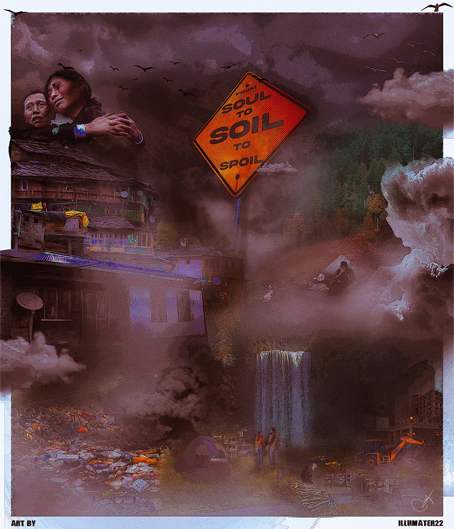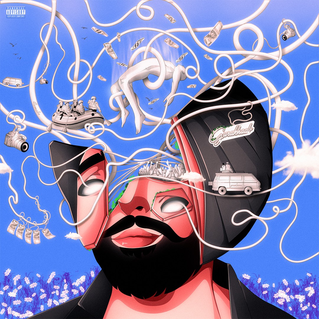 For Dreaming Loud, the cover translates Gurukhaab’s inner world into a surreal, illustrated dreamscape. The artwork places the artist at the core, with his mind opening up as the soul drifts into a floating dream state symbolizing ambition, escape, and self-exploration. White threads weave through the scene, connecting elements like travel, money, and filmmaking, representing tangled thoughts and the constant motion of an artist’s journey.